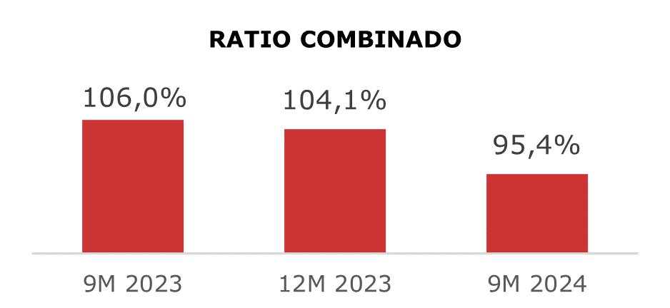 La evolución positiva de la cuenta de resultados del Grupo es fruto, en primer lugar, de la mejora del ratio combinado, que a cierre del tercer trimestre de 2024 se ha situado en el 95,4%, 10,6 puntos porcentuales mejor que un año antes.