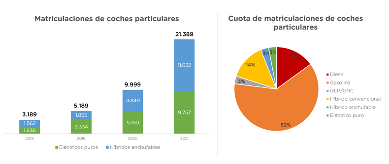 Las cifras de matriculaciones confirman, por ahora, esta tendencia. Aunque casi 8 de cada 10 turismos que se comercializan siguen siendo coches diésel y gasolina, el año pasado se vendieron en España 21.389 coches enchufables a particulares (+114%), un 6% del total. De ellos, 11.632 (+140%) fueron híbridos enchufables y 9.757 (+90%) eléctricos puros. Es más, si a ello se suma los 53.200 híbridos no enchufables matriculados, estos suman ya una cuota del 17% sobre el total de turismos vendidos en 2021.