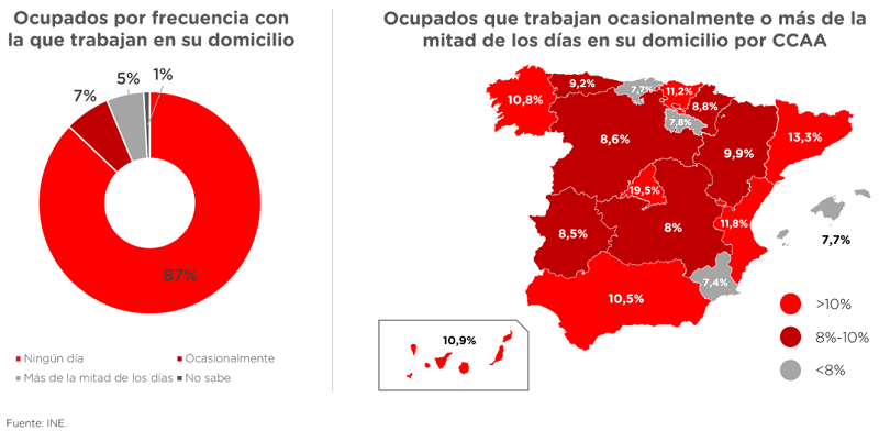 El confinamiento derivado de la pandemia del Covid-19 obligó a millones de personas a trabajar desde su casa. Tras la vuelta a la normalidad, el teletrabajo se ha instaurado como una rutina en muchas empresas. Actualmente, cerca de 2,5 millones de empleados en España desempeñan a distancia sus tareas profesionales ocasionalmente o más de la mitad de los días, según la Encuesta de Población Activa (EPA) del Instituto Nacional de Estadística (INE) del tercer trimestre de 2022. Esto supone que el 12% de las personas ocupadas trabajan con cierta regularidad desde su domicilio.