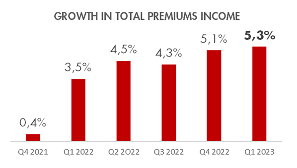 The Group's claims ratio stood at 86.3% (+17.1%) and the combined ratio at 107.3%, due to severe cost inflation, which remains at very high levels, considering that in the first three months of the year the average CPI was 5% and the Industrial Price Index was 7.8%. Margins were also penalised by the 8.5% increase in the scale of injuries for this year, on top of the 4.1% increase in 2022. Furthermore, the frequency of claims rebounded compared to the first quarter of 2022, when mobility decreased due to the effect of the Omicron variant of COVID-19.