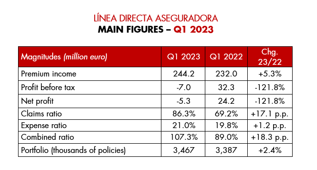 Madrid, 21 April 2023.- Línea Directa Aseguradora saw a net loss of 5.3 million euros in the first quarter of 2023, impacted by cost inflation and a rebound in claims frequency compared to an atypical first quarter in 2022 due to Omicron, both of which are having a negative effect on margins in the insurance sector, especially in Motor. On a positive note, the company has continued to improve its revenue growth and has maintained a controlled expense ratio and a firm solvency level.