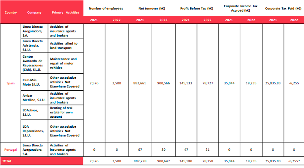 * This figure includes the Corporate Income Tax paid in 2022 as well as the amounts refunded by the AEAT in relation to the Corporate Income Tax for the years 2020 and 2021, hence the negative balance