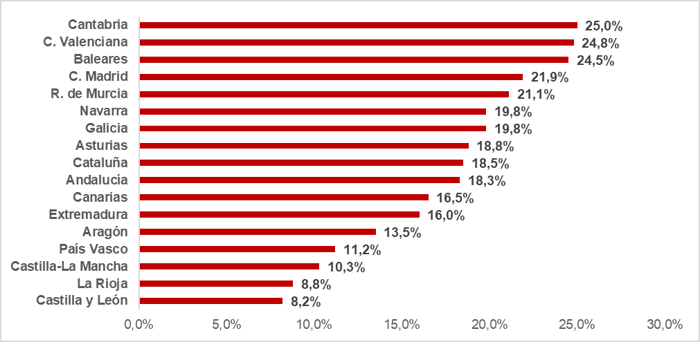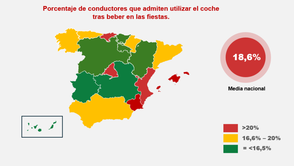 Por territorios, las comunidades con mayor porcentaje de conductores que admiten conducir en estas fechas tras haber bebido alcohol son Cantabria (25%), Comunidad Valenciana (24,8%) y Baleares (24,5%), mientras que Castilla y León (8,2%), La Rioja (8,8%) y Castilla La Mancha (10,3%) son las que cuentan con las cifras más bajas, muy lejos de la media nacional, que se encuentra en el 18,6% de los automovilistas.