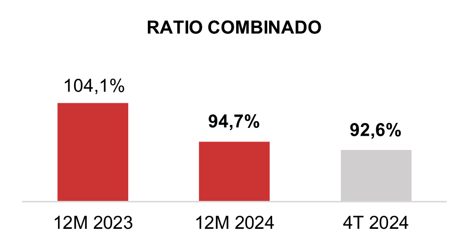 La evolución positiva de la cuenta de resultados del Grupo se explica, por un lado, por la mejora sobresaliente del ratio combinado, que a cierre del ejercicio se ha situado en el 94,7%, 9,4 puntos porcentuales mejor que en 2023. Este indicador ha mostrado una mejora progresiva trimestre a trimestre y en el cuarto trimestre estanco ha bajado hasta el 92,6%.
