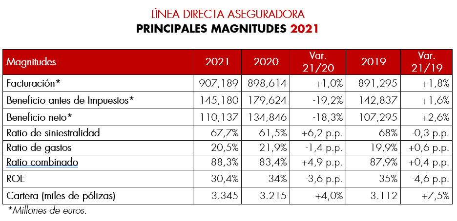 - Línea Directa Aseguradora cerró 2021 con unos sólidos márgenes técnicos a pesar de la recuperación de la siniestralidad, el contexto inflacionario y el impacto de los fenómenos atmosféricos. A pesar de ello, y gracias al rigor en la suscripción y la disciplina en gastos, el ratio combinado de la compañía se situó en el 88,3% y la rentabilidad sobre fondos propios (ROE) en el 30,4%.